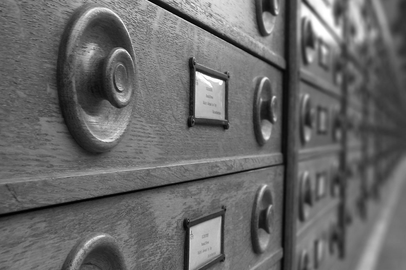 Photographie noir et blanc des tiroirs au musée National de l’Histoire Naturelle (MNHN)